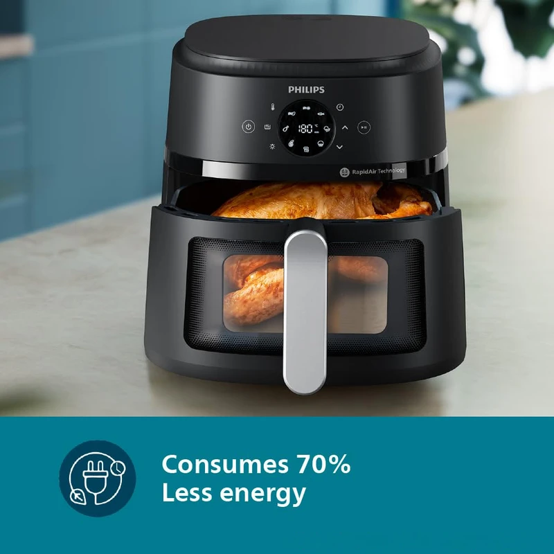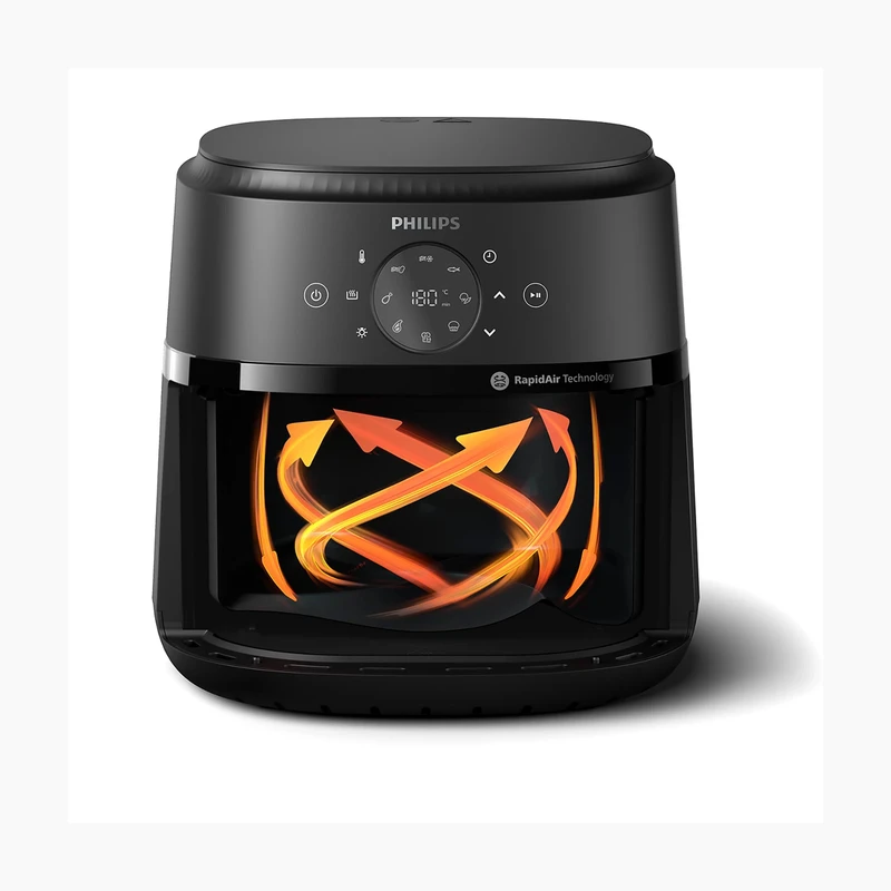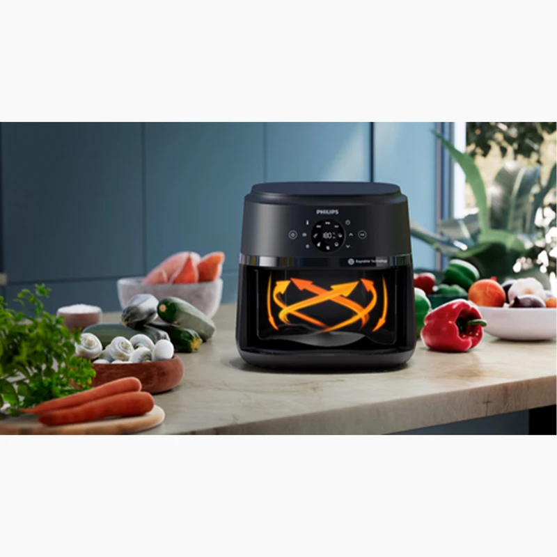 قلب تپنده‌ی عملکرد بی‌نظیر این سرخ‌کن، فناوری انحصاری Rapid Air فیلیپس است. این تکنولوژی پیشرفته، با استفاده از یک المنت حرارتی قدرتمند ۱۷۰۰ واتی و یک فن با طراحی خاص که هوای داغ را با سرعت بسیار زیاد و به شکلی گردابی و ستاره‌ای شکل در اطراف مواد غذایی به گردش درمی‌آورد، پختی کامل، یکنواخت و سریع را تضمین می‌کند. نتیجه‌ی این گردش هوای ۳۶۰ درجه، ایجاد یک لایه‌ی بیرونی فوق‌العاده ترد و طلایی، و در عین حال، حفظ رطوبت و آبدار بودن بخش داخلی مواد غذایی است؛ آن هم با کاهش مصرف روغن تا ۹۰ درصد نسبت به روش‌های سرخ کردن سنتی. نکته‌ی قابل توجه دیگر در این مدل، “طراحی منحصربه‌فرد برای پخت یکنواخت حتی بدون برگرداندن غذا” است. این طراحی هوشمندانه‌ی داخلی سبد و جریان هوا، تضمین می‌کند که حرارت به طور یکسان به تمام نقاط ماده‌ی غذایی برسد و دیگر نیازی به هم زدن یا برگرداندن مداوم غذا برای پخت یکدست نباشد. این ویژگی، راحتی و صرفه‌جویی در زمان را برای کاربر به همراه دارد.