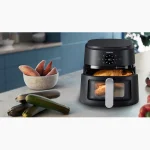 فیلیپس NA231/00 با ابعاد ۴۰.۴ در ۳۰.۹ در ۳۰.۸ سانتی‌متر و وزن ۴.۳ کیلوگرم، حضوری متعادل و در عین حال مدرن و جذاب در آشپزخانه‌ی شما خواهد داشت. بدنه‌ی دستگاه از پلاستیک با کیفیت و مقاوم ساخته شده است. اما آنچه این مدل را از بسیاری از رقبای خود متمایز می‌کند، طراحی هوشمندانه‌ی محفظه‌ی پخت آن است. این سرخ‌کن به یک “قسمت شیشه‌ای بر روی محفظه” مجهز است؛ یک پنجره‌ی شفاف که به شما اجازه می‌دهد تا بدون نیاز به باز کردن کشو و اتلاف حرارت، به طور مستقیم بر فرآیند پخت غذا نظارت داشته باشید و 10از طلایی شدن و پخت کامل آن اطمینان حاصل کنید. این ویژگی ساده اما بسیار کاربردی، کنترل بیشتری بر آشپزی به شما می‌دهد و از خشک شدن یا سوختن احتمالی غذا جلوگیری می‌کند. پنل کنترل دیجیتال لمسی با نمایشگر LED، علاوه بر زیبایی، دسترسی آسان و دقیقی به تنظیمات دما، زمان و برنامه‌های پخت پیش‌فرض را فراهم می‌کند. طراحی کلی دستگاه، با تمرکز بر کاربری آسان و ایمنی، تجربه‌ای بی‌دغدغه از آشپزی را برای شما به ارمغان می‌آورد.
