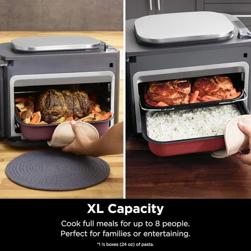 ظرفیت دستگاه 12.5 لیتری بوده که امکان تهیه انبوهی از مواد غذایی را برای حدود 8 نفر فراهم کرده و می توانید همزمان چندین نوع غذای متنوع و خوشمزه را در حجم زیاد درست کنید. ظرفیت بالا نشان می دهد که این دستگاه برای خانواده های پرجمعیت و مهمانی دادن بسیار مناسب است. با این ظرفیت می توانید 1.5 کیلوگرم ماکارونی، 4 فنجان یا یک کیلوگرم برنج، مرغ 2.5 کیلویی، کباب 2.3 کیلویی، 900 گرم سیب زمینی سرخ شده و یا یک پیتزای 25 سانتی متری را درست کنید.